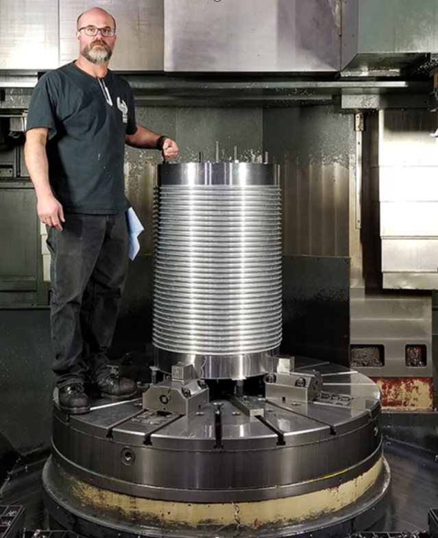 “It took us seven hours to put in this groove, which if you laid out in a straight line would measure 212 linear feet,” said Roberts. “We had to use a mill and a rotary to make rough, then finish the part. We did the deburr on a VTL in seven hours. It’s just beautiful.”